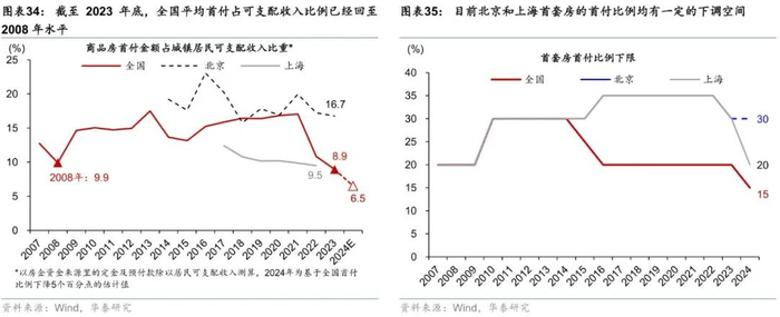 房贷利率、首付比例下降、推迟购房决策等均边际上减轻购房者购房支出压力、在收入增速趋稳的背景下有望减少地产的“挤出效应”。对购房者而言,房贷利率、首付比例的调整有望边际降低房贷压力。从房价收入比及还贷现金流的视角看,中国居民购房的负担能力可能已经与2015-16年左右水平相当;而从购房首付“门槛”看,居民买房负担能力亦已录得近年来较高水平。随着稳地产政策持续加码,尤其是2024年9月底以来,包括首付比例、房贷利率、地产相关税收等在内的地产金融政策已放松至历史最低水平(图表34-37)。近期出台的收储、回收闲置土地等政策有助于边际缓解开发商现金流压力。2021年以来,虽然居民收入增速边际放缓,但房价调整推动房价收入比持续下行,居民购房首付比例下调后,首付占收入比例亦降至历史最低水平。房贷支出占城镇居民可支配收入水平亦随着房贷利率下调有所降低。随着房贷利率不断下降,居民还贷现金流压力得到边际缓解。根据贝壳主流房贷利率数据,目前我国平均的首套房贷利率已经回落至3.19%的历史低位,与此同时,2024年居民房贷支出占可支配收入的比例亦已下降至2017年的水平。