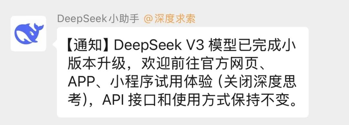 同日,DeepSeek在其官方交流群宣布称,DeepSeek V3模型已完成小版本升级,欢迎前往官方网页、App、小程序试用体验(关闭深度思考),API接口和使用方式保持不变。