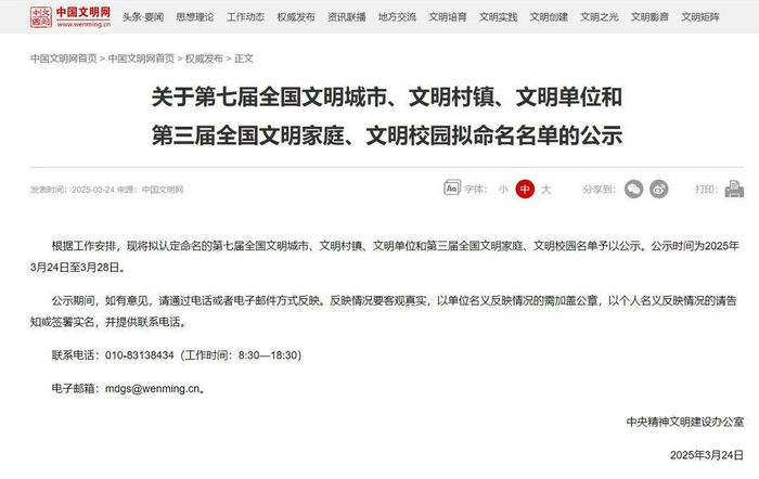 3月24日,中央精神文明建设办公室公示拟认定命名的第七届全国文明城市、文明村镇、文明单位和第三届全国文明家庭、文明校园名单。
