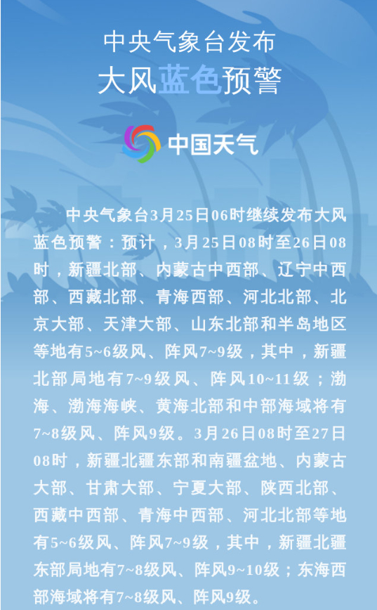 中央气象台3月25日06时继续发布大风蓝色预警:预计,3月25日08时至26日08时,新疆北部、内蒙古中西部、辽宁中西部、西藏北部、青海西部、河北北部、北京大部、天津大部、山东北部和半岛地区等地有5~6级风、阵风7~9级,其中,新疆北部局地有7~9级风、阵风10~11级;渤海、渤海海峡、黄海北部和中部海域将有7~8级风、阵风9级。3月26日08时至27日08时,新疆北疆东部和南疆盆地、内蒙古大部、甘肃大部、宁夏大部、陕西北部、西藏中西部、青海中西部、河北北部等地有5~6级风、阵风7~9级,其中,新疆北疆东部局地有7~8级风、阵风9~10级;东海西部海域将有7~8级风、阵风9级。