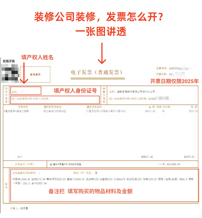 发票类型为税务发票,开票日期要求在2025年1月1日后。发票购买方名称填写产权人姓名,购买方纳税人识别号填写产权人身份证号,购买方、身份证要求与产权人一致。