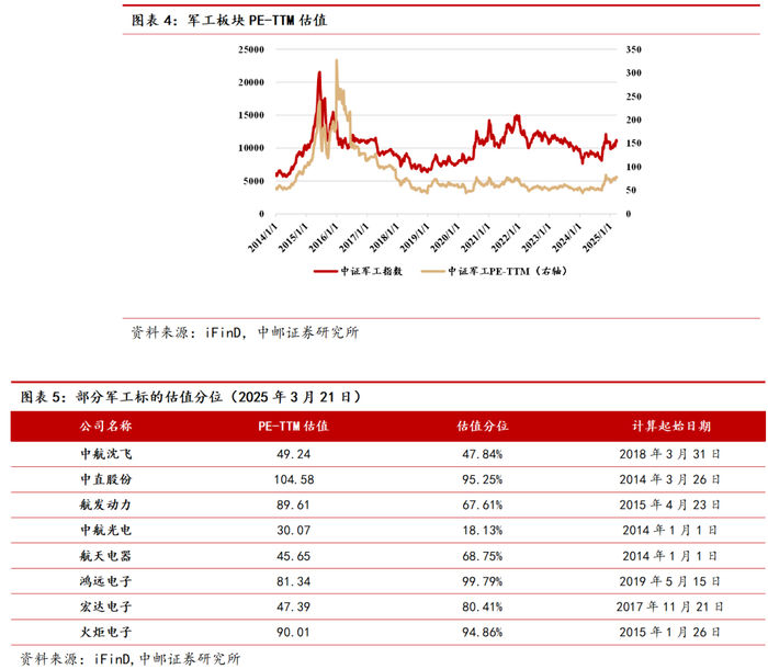 截至2025年3月21日,中证军工指数为11011.63,军工板块PE-TTM估值为77.57,军工板块PB估值为3.50。军工板块PE-TTM估值和PB估值均处于历史中部位置,自2014年1月1日起,历史上有70.49%的时间板块PE-TTM估值低于当前水平,49.64%的时间板块PB估值低于当前水平。