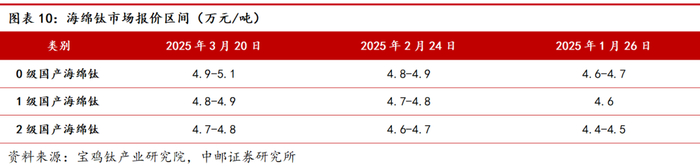 海绵钛价格跟踪:宝鸡钛产业研究院3月20日给出海绵钛市场报价区间:0级国产海绵钛价格4.9-5.1万元/吨;1级国产海绵钛价格4.8-4.9万元/吨;2级国产海绵钛价格4.7-4.8万元/吨。
