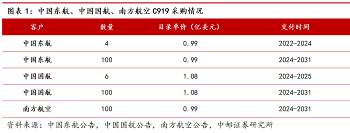 C919生产交付节奏有望加快。2024年4月27日,中国国航公告,与商飞公司于2024年4月26日签订协议,向商飞公司购买100架C919飞机(增程型),新飞机将于2024至2031年分批交付。2024年4月29日,南方航空与中国商飞签订100架C919飞机购买协议,新飞机计划于2024-2031分批交付。C919先上产能再逐步上量,生产交付节奏有望加快。