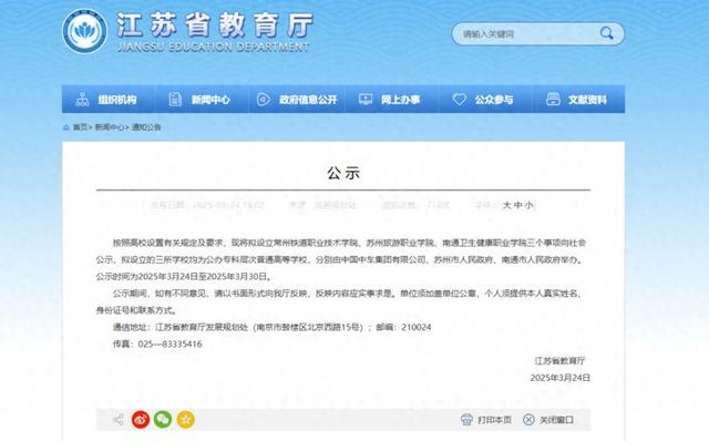 交汇点讯 3月24日,江苏省教育厅发布公示:按照高校设置有关规定及要求,现将拟设立常州铁道职业技术学院、苏州旅游职业学院、南通卫生健康职业学院三个事项向社会公示,拟设立的三所学校均为公办专科层次普通高等学校,分别由中国中车集团有限公司、苏州市人民政府、南通市人民政府举办。公示时间为2025年3月24日至2025年3月30日。