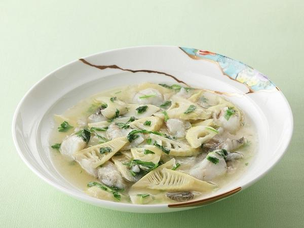 春日食用刀鱼,是江南沿海地区由来已久的风俗习惯。清明节气前,海刀鱼进入洄游期,肉质经锻炼愈发鲜嫩细腻。上海老饭店的厨师们将新鲜海刀鱼手工剔骨,取鱼肉与韭菜调味制成馅料,包成馄饨。剔下的鱼骨也派上大用场:熬煮成奶白色浓汤,加入特调金汤与鲜嫩春笋块,再搭配海刀鱼馄饨,一碗鲜掉眉毛的鲜笋酸汤刀鱼馄饨就此诞生。