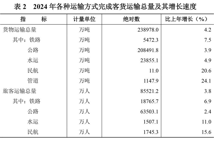 [8]货物运输总量及周转量包括铁路、公路、水路、民航和管道五种运输方式完成量,2024年增速按可比口径计算。