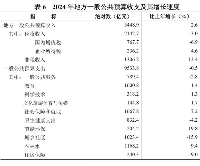 全年地方一般公共预算收入3448.9亿元,比上年增长2.6%。其中,税收收入2142.7亿元,下降3.0%;非税收入1306.2亿元,增长13.4%。税收收入中,国内增值税767.7亿元,下降6.9%;企业所得税236.2亿元,增长4.6%。一般公共预算支出9533.8亿元,下降0.5%。其中,教育支出1600.8亿元,增长1.4%;社会保障和就业支出1667.8亿元,增长7.2%;卫生健康支出832.4亿元,下降4.2%;科学技术支出318.2亿元,增长1.3%;住房保障支出240.3亿元,下降9.0%。