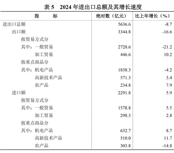全年进出口总额[21]5636.6亿元,比上年下降8.7%。其中,出口3344.8亿元,下降16.6%;进口2291.8亿元,增长5.9%。分贸易方式看,一般贸易出口2728.6亿元,下降21.2%;加工贸易出口446.6亿元,增长10.2%。重点出口商品中,机电产品1838.3亿元,下降4.2%;高新技术产品571.3亿元,增长3.4%。分产销国别(地区)看,出口美国314.6亿元,下降30.1%;出口中国香港463.0亿元,下降13.7%;出口欧盟[22]326.1亿元,下降8.3%;出口东盟599.4亿元,下降21.3%;出口共建“一带一路”[23]国家1879.4亿元,下降16.0%。