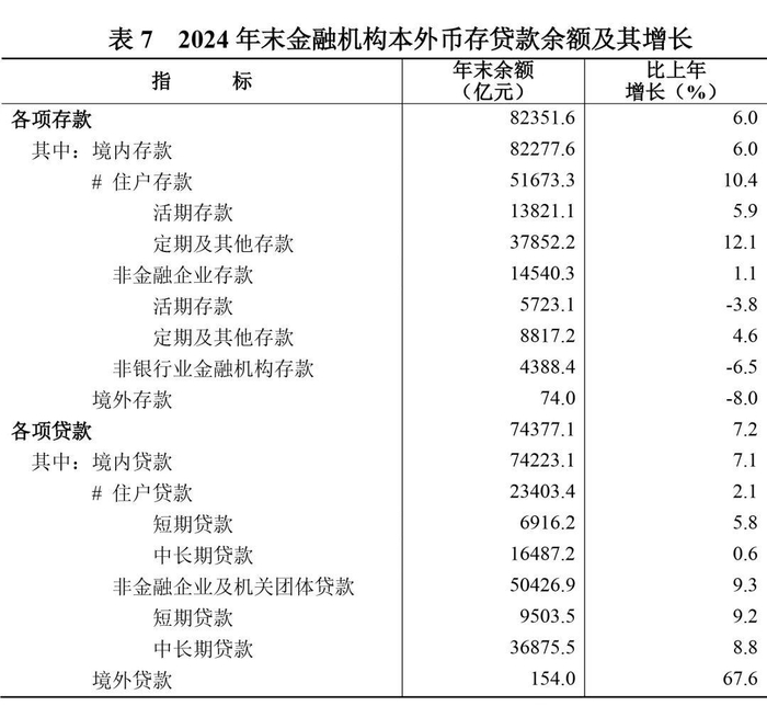 年末金融机构本外币各项存款余额82351.6亿元,比上年末增长6.0%。其中,住户存款余额51673.3亿元,增长10.4%;非金融企业存款余额14540.3亿元,增长1.1%。本外币各项贷款余额74377.1亿元,增长7.2%。其中,住户贷款余额23403.4亿元,增长2.1%;非金融企业及机关团体贷款余额50426.9亿元,增长9.3%。