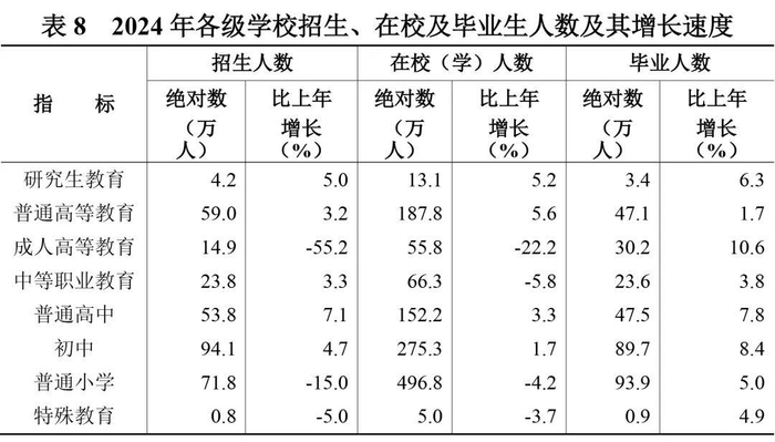 年末有普通高校128所。研究生教育毕业生3.4万人,普通高等教育毕业生47.1万人,中等职业教育[25]毕业生23.6万人,普通高中毕业生47.5万人,初中毕业生89.7万人,普通小学毕业生93.9万人。在园幼儿158.1万人,比上年下降13.9%。小学适龄儿童入学率[26]100%。各类民办学校8948所,在校学生202.4万人。发放高校国家奖学金、助学金(本专科生)16.9亿元,资助高校学生(本专科生)81.5万人次。发放中职国家助学金4.8亿元,资助中职学生48.2万人次。落实义务教育保障资金115.5亿元,发放普通高中国家助学金5.3亿元。