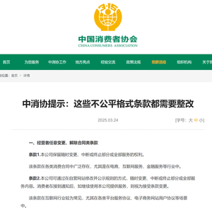 3月24日,中消协官网发布提示:这些不公平格式条款都需要整改。记者查询发现,此番被中消协点名的不公平格式条款共涉及十大类,其中不乏日常生活中常见的,如“本公司保留随时变更、中断或终止部分或全部服务的权利”“赠品、奖品不含三包”“本平台对经营者信息的准确性和真实性不做任何保证”等。