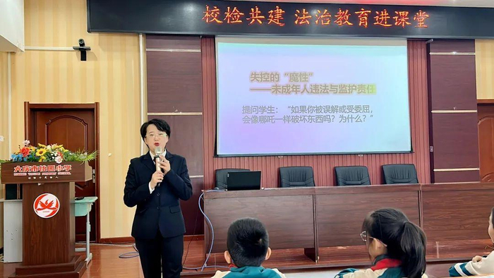 3月24日下午,怡园小学的同学们迎来了一堂别开生面的法治课。本次法治课由让区检察院未成年人检察官王欣担任讲师,校领导、教导处以及四年二班的同学们共同参加了本场法治宣讲现场活动,不能亲临现场的班级则通过网络同步观看了现场直播。