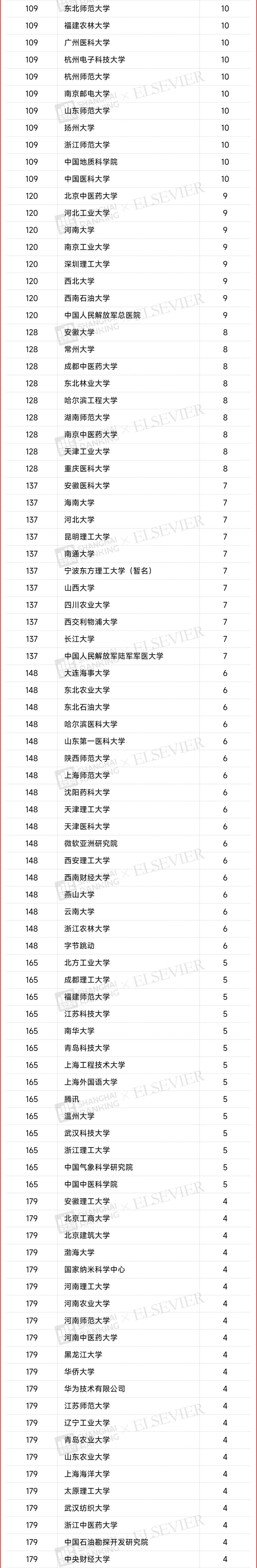 高校中,共有10所大学的高被引学者数量超过了100位,分别是清华大学(279位)、浙江大学(256位)、北京大学(219位)、上海交通大学(196位)、复旦大学(159位)、华中科技大学(129位)、中国科学技术大学(120位)、南京大学(117位)、武汉大学(116位)、中山大学(112位)