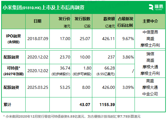 此次配售完成后,小米集团香港IPO及再融资金额合计将逾1155亿港元。