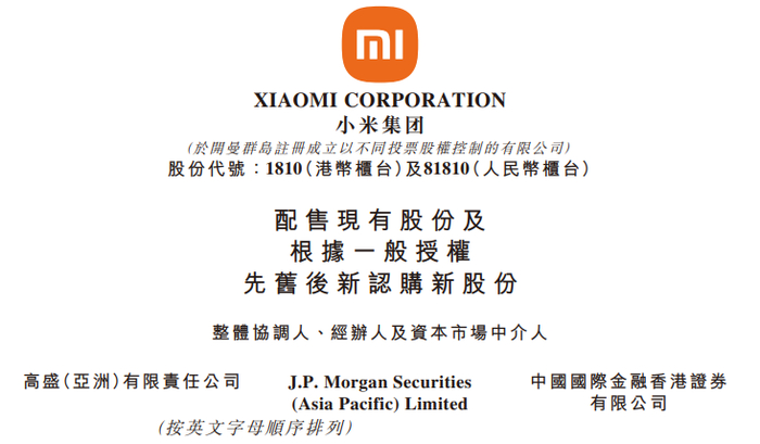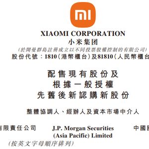 小米集团此次配售,高盛、摩根大通、中金公司为其整体协调人、经办人及资本市场中介人。