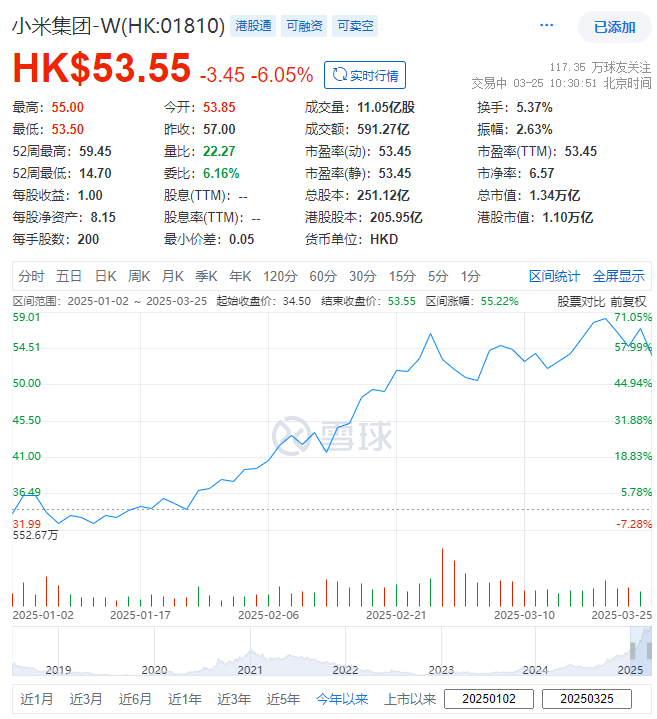 小米集团近期股价受其电动车SU7销售行情带动,截至午间收市,今年以来累计上涨55.22%,上市以来累计上涨215.59%,现每股报53.55港元,总市值约1.34万亿港元.