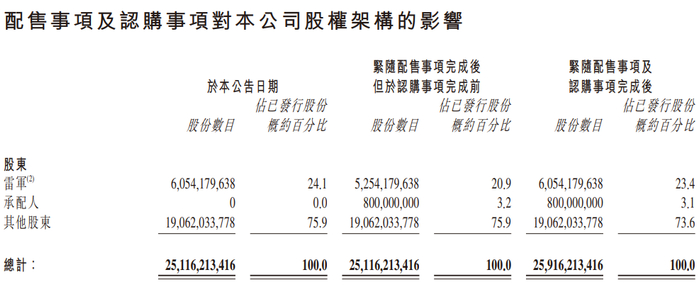 配售及认购事项完成后,小米集团总股本增至约259.16亿股,雷军先生在小米集团的持股将由24.1%摊薄至23.4%,投票权将由64.9%微降至64.1%。