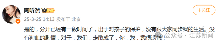 3月25日,女演员陶昕然发微博承认离婚:是的,分开已经有一段时间了,出于对孩子的保护,没有跟大家同步我的生活。没有狗血的剧情,对于,我们,走散成了,你,我,我很遗憾!