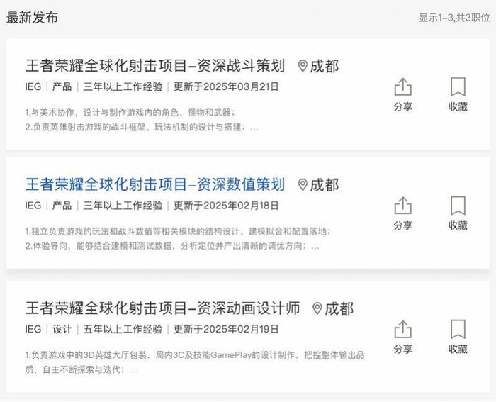 根据腾讯官方招聘网站,近期腾讯游戏也在招聘王者荣耀全球化射击项目的资深战斗策划、资深数值策划和资深动画设计师。