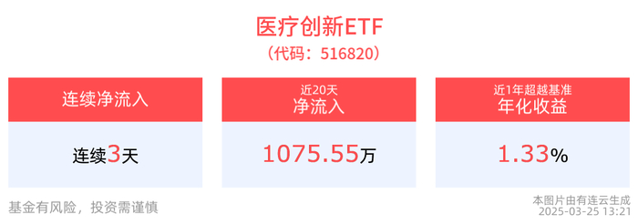 从资金净流入方面来看,医疗创新ETF近3天获得连续资金净流入,最高单日获得685.73万元净流入,合计“吸金”1407.18万元,日均净流入达469.06万元。