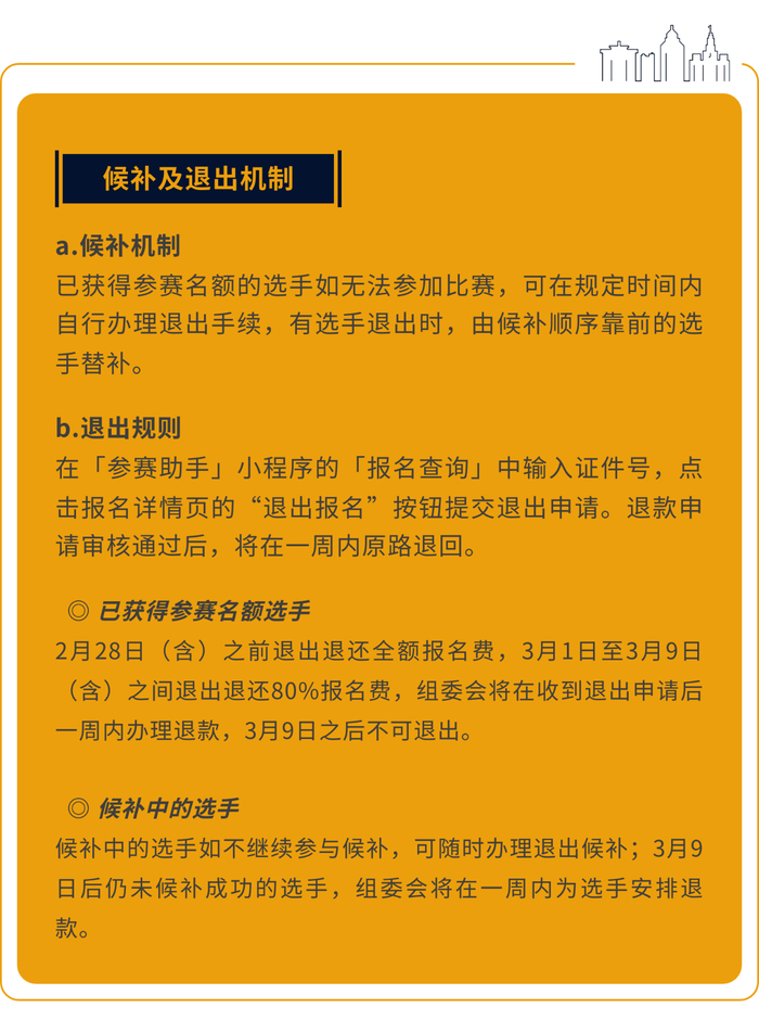 候补序号将从2月26日起至3月10日(候补截止后一天),每天10:00根据前一天退出情况进行统一更新,选手可在小程序的「报名查询」页面获取自己的候补位置。
