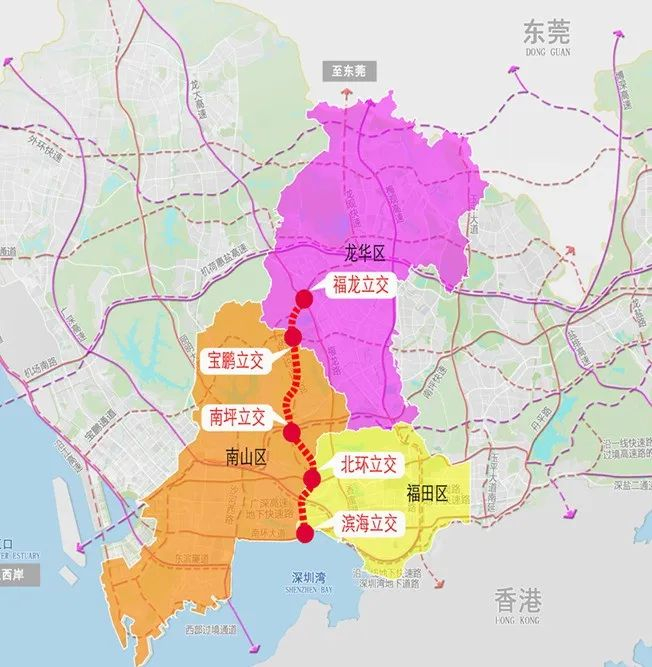 往北与龙观快速(龙澜大道)衔接构成深圳市“八横十三纵”干线路网体系中的“一纵”,是全市高快速路网的重要组成部分,主要承担南山、福田西部与龙华、东莞方向的交通联系,并承担横向道路的交通转换以及沿线的服务功能。