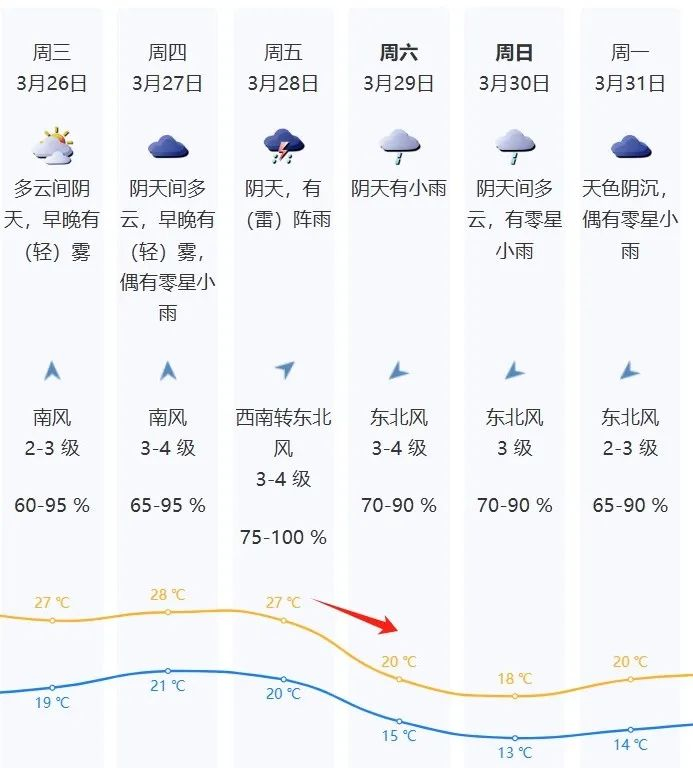 28日转雷阵雨,可能伴有8级左右短时大风,气温下降;