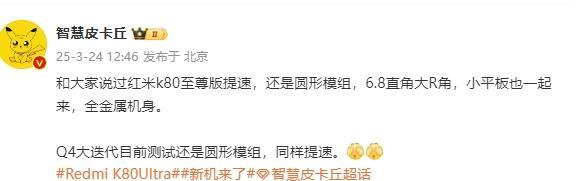 按照去年的发布计划,REDMI K80至尊版本会在7月份的雷军年度演讲上发布,但最新消息显示,这款新机的发布时间将提前。3月24日,有数码博主爆料称,REDMI K80至尊版的发布日期已经提速,外观将延续圆形模组设计,屏幕为6.8英寸,直角边框搭配大R角,同期还有小平板,机身采用全金属材质打造。
