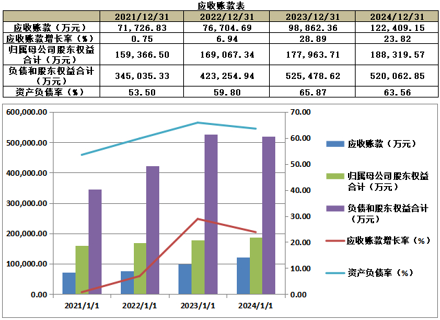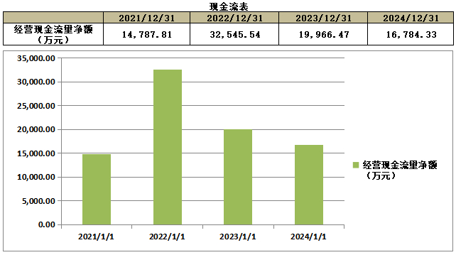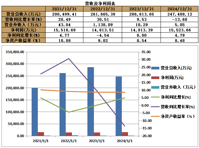 业绩情况:2021-2024年底,公司的营业收入分别为200,499.41万元、261,665.30万元、286,613.65万元、247,408.12万元,年均复合增长率为5.40%;归母净利润分别为15,518.69万元、14,813.51万元、14,813.39万元、15,523.66万元,年均复合增长率为0.01%。
