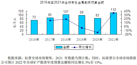 从全球和中国有色金属勘探投入的波动情况看,与有色金属价格指数的波动趋势总体保持一致,2016 年至 2021 年全球和中国有色金属勘探投入总体呈现出先升后降,最后在 2021 年开始出现恢复上升的态势。