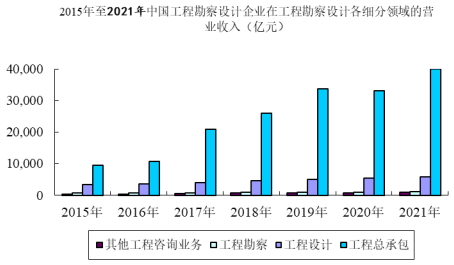 从行业各细分领域看,近年来,工程勘察、工程设计、工程总承包、其他工程咨询业务的营业收入总体都保持稳步增长的态势(2020 年工程总承包营业收入略有降低之外)。中国工程勘察设计行业各细分领域营业收入变动情况如下图所示: