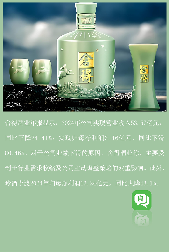 舍得酒业年报显示,2024年公司实现营业收入53.57亿元,同比下降24.41%;实现归母净利润3.46亿元,同比下滑80.46%。对于公司业绩下滑的原因,舍得酒业称,主要受制于行业需求收缩及公司主动调整策略的双重影响。