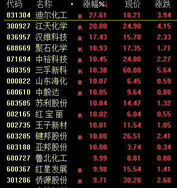 化工等周期板块表现活跃,江天化学、中毅达、红宝丽、鲁北化工、苏利股份等封板。