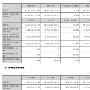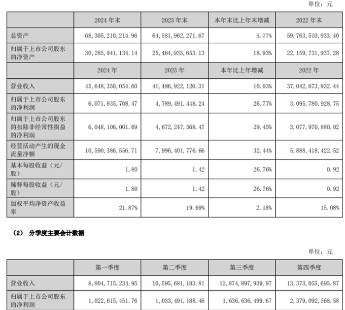 2024年,卫星化学营业收入达到456.48亿元,同比增长10.03%;归母净利润达60.72亿元,同比增长26.77%;扣非净利润为60.48亿元,同比增长29.45%;基本每股收益1.8元,同比增长26.76%。
