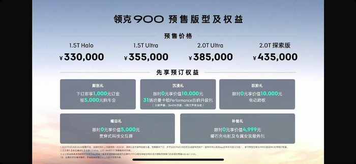 3月25日,领克900正式开启预售,价格区间33万—— 43.5万元。