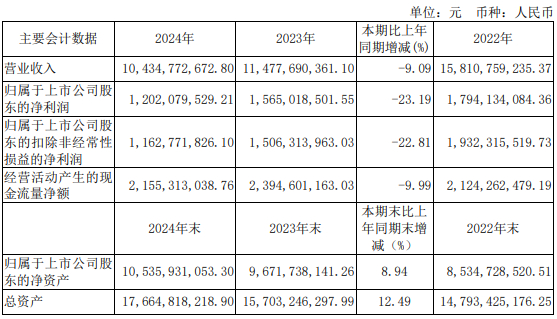 世界农化网中文网报道:3月25日,扬农化工(600486.SH)发布2024年年度报告,公司2024年年度营业收入104.35亿元,同比下降9.09%; 归属于上市公司股东的净利润12.02亿元,同比下降23.19%; 归属于上市公司股东的扣除非经常性损益的净利润11.63亿元,同比下降22.81%; 基本每股收益2.978元/股。