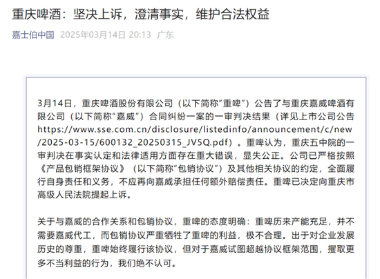 面对这一判决,重庆啤酒反应激烈,直指“一审判决认定事实不清,适用法律错误”,“公司将坚决提起上诉”,誓要为自己讨回公道。