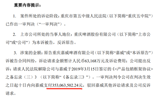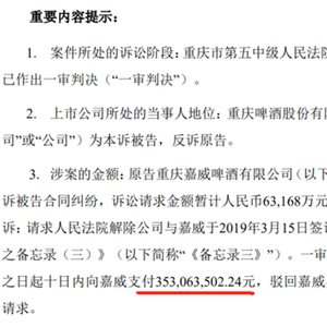 3月14日晚,重庆啤酒公告,其与参股公司重庆嘉威啤酒有限公司的合同纠纷,被重庆第五中级人民法院一审判决,要求重庆啤酒在判决生效后十天内向嘉威啤酒支付3.53亿元。