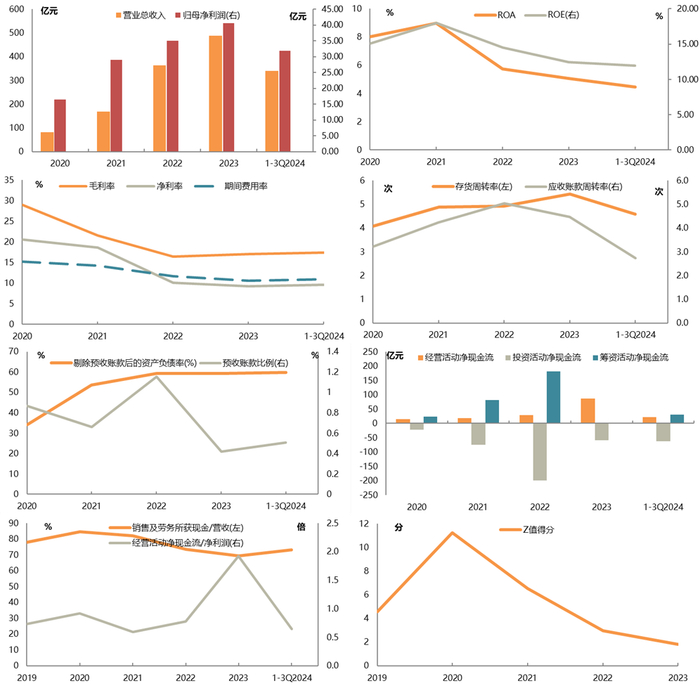 近年来公司营收利润规模保持增长趋势,2019-2023年营收复合增速为66.08%,同期归母净利润复合增速为27.72%。1-3Q2024公司营收340.49亿元,同比下滑4.16%,归母净利润31.89亿元,同比下滑6.88%,公司毛利率17.38%,同比上升0.6pct。
