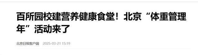 3月21日,北京市“体重管理年”活动实施方案问世,提出北京将在今年组建百人科普专家团队,举办百场体重管理技能讲座,开展百场营养知识进社区活动,并在百所中小学校和幼儿园创建营养健康食堂。