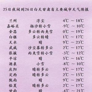 另外,预计25日下午至27日,河西五市及白银、甘南、天水、平凉、庆阳等市州及兰州北部、临夏北部、定西东部有5级左右西北风,阵风7-8级,部分地区有扬沙或浮尘。