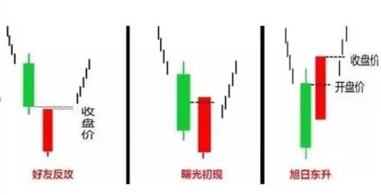 好友反攻、曙光初现、旭日东升K线形态相似,因此放在一起。三者反转信号逐个提高,在连续下行之后,出现此信号千万要注意。