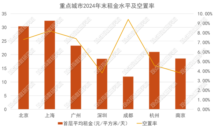 零售市场表现上,截止2024年四季度末,一线城市中,除深圳保持3.8%的较低空置率外,北上广均在7%-8%左右的水平。二线城市空置率则在3-10%之间,其中成都的空置率较高,为9.4%。整体来看,目前重点商业城市的零售项目面临不小的去化压力,维持较高出租率并非易事。