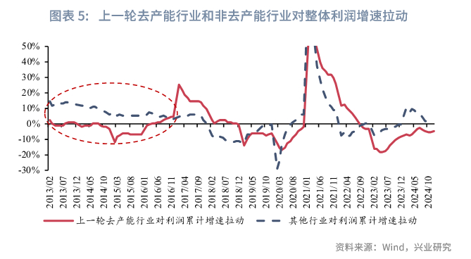 我们进一步探讨在上一轮产能治理后,过剩行业的产能利用率恢复如何影响整体工业企业盈利和PPI。根据图表1中颁布去产能政策的行业领域,我们将上一轮去产能行业的范围划定为:煤炭(煤炭开采和洗选业,石油、煤炭及其他燃料加工业)、钢铁(黑色金属矿采选业、黑色金属冶炼及压延加工业)、建材(非金属矿采选业、非金属矿物制品业)、有色(有色金属矿采选业、有色金属冶炼及压延加工业)、石化(石油和天然气开采业、化学原料及化学制品制造业)。