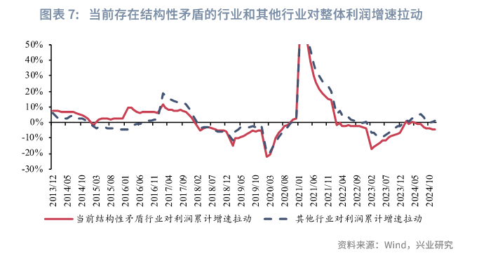 将视角转回至当下,我们进一步考察当前存在结构性矛盾的行业对整体利润和PPI增速的影响。根据前文的分析,当前存在结构性矛盾问题的行业主要为:农副食品加工、石油煤炭加工、化学原料及制品、非金属制品业、汽车、电气机械、电子设备7个行业。