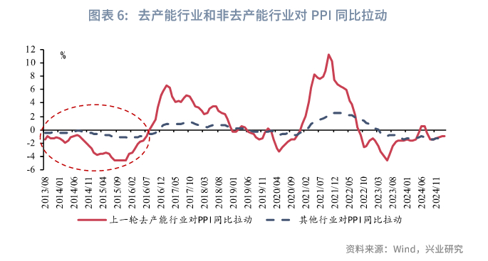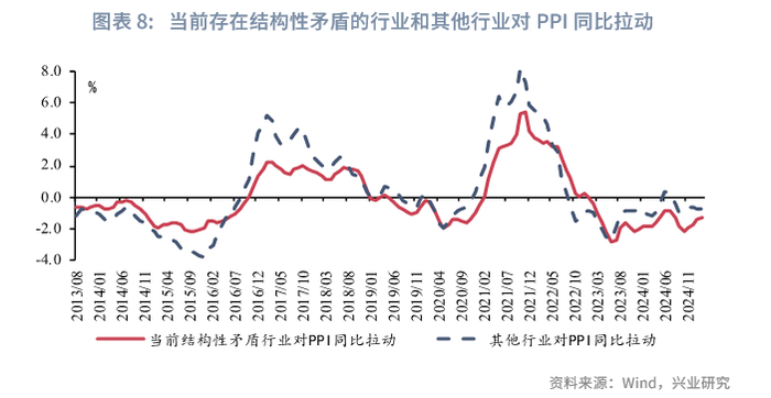 从上述行业对当前利润增速的影响来看,2023和2024年上述行业对整体工业企业利润同比的拖累分别为6.5和4.4个百分点,其他行业在2023年对整体利润增速的拖累为2.1个百分点,2024年拉动1.1个百分点。从对PPI同比的影响来看,上述存在结构性矛盾的行业在2023和2024年对PPI同比的拖累分别为1.7和1.6个百分点,2025年1-2月拖累PPI 1.3个百分点,其他行业2023、2024和2025年1-2月的拖累值分别为1.4、0.6和0.7个百分点。