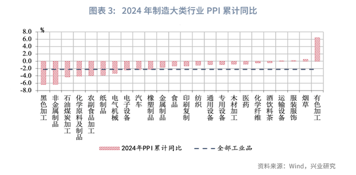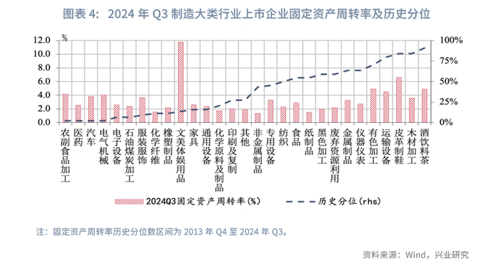 价格方面,我们采用PPI来衡量行业的价格变动情况,筛选2024年PPI累计同比低于全部工业品均值的行业。产能利用率方面,由于国家统计局公布的产能利用率未包含所有的制造业大类行业,我们采用上市企业的固定资产周转率[4]来衡量行业的产能利用率现状,筛选2024年第三季度固定资产周转率处于历史50%分位数以下的行业。以上两个筛选标准取交集,数据显示,农副食品加工、石油煤炭加工、化学原料及制品、非金属制品、汽车、电气机械、电子设备7个行业,目前处于相对较低的价格水平和产能利用率水平,“内卷”的程度可能更深。