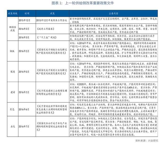 上一轮供给侧改革于2015年末启动,2016年围绕钢铁、煤炭等重点行业的产能治理政策陆续出台。2015年11月,习近平总书记在中央财经领导小组第十一次会议上,首次提出供给侧结构性改革,要求“在适度扩大总需求的同时,着力加强供给侧结构性改革,着力提高供给体系质量和效率,增强经济持续增长动力”。2015年12月中央经济工作会议提出“着力加强结构性改革,在适度扩大总需求的同时,去产能、去库存、去杠杆、降成本、补短板”,明确“三去一降一补”的五大任务,“去产能”位列供给侧结构性改革五大任务首位。2016年《政府工作报告》中提出“着力化解过剩产能和降本增效。重点抓好钢铁、煤炭等困难行业去产能,坚持市场倒逼、企业主体、地方组织、中央支持,运用经济、法律、技术、环保、质量、安全等手段,严格控制新增产能,坚决淘汰落后产能,有序退出过剩产能”。2026年3月16日发布的《“十三五”规划》中提出,“积极稳妥化解产能过剩,综合运用市场机制、经济手段、法治办法和必要的行政手段,加大政策引导力度,实现市场出清。……加快钢铁、煤炭等行业过剩产能退出”。