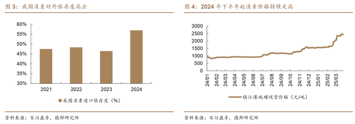 供给侧:我国溴素对外依存度高,红海局势升温或波及进口。我国溴素资源十分短缺,主要分布在山东省莱州湾的地下卤水中。近年来,山东卤水水位和品位下降很快,有效产能不断收缩,因此我国溴素高度依赖进口,进口量由2021年的6.3万吨提升至2024年的7.7万吨,依存度由47.3%提升至56.8%。海外角度看,死海是世界上溴元素含量最丰富的地方之一,湖水中溴浓度高达2000-12000ppm,远高于海水的65ppm。依托死海溴资源,以色列化工集团、约旦溴业公司、以及美国雅保三者合计溴素产量占到全球总产量的72%以上,供给高度集中。据新华社报道,近期红海局势再升温,涉及红海、阿拉伯海、曼德海峡和亚丁湾的航线或受影响。地缘政治风险下,以色列出口船只绕行好望角成为缓解原航线受阻的重要方式。但航程延长增加了供应链压力,同时提高了货运和保险成本,或使溴素供应进一步趋紧。据百川盈孚,当前我国溴素企业虽开工稳定,但溴含量尚未恢复正常水平,产量偏低,企业整体库存水平不高,而进口溴素到货延期,且仍未得到补充,或系红海危机影响持续外溢,我们预计供小于求态势仍将延续。